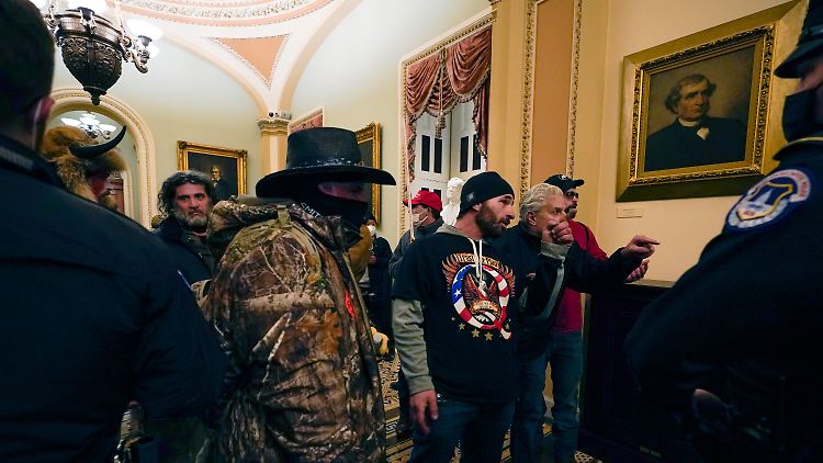Mit gezogenen Waffen müssen Trump-Anhänger davon abgehalten werden, in den Sitzungssaal einzudringen.