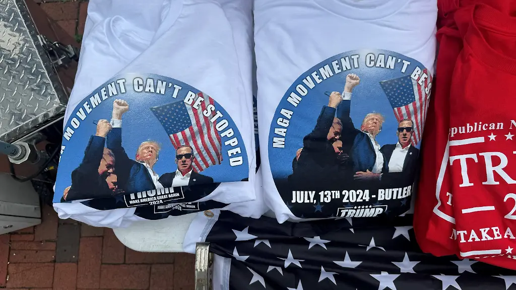 Parteitage und Wahlkampfveranstaltungen in den USA bieten traditionell findigen Unternehmern Gelegenheit, vom Verkauf von Fanartikeln an treue Anhänger zu profitieren. Das Bild von Donald Trump kurz nach dem Attentat wird so zu Merchandise und findet natürlich Gefallen im Lager der Republikaner.