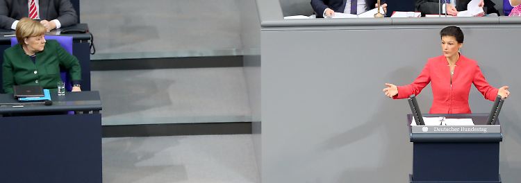 "In Deutschland wachsen soziale Ungleichheit und Verunsicherung, und mit ihnen die Wahlergebnisse der AfD", sagt sie gleich zum Auftakt. Als Oppositionsführerin war sie die erste Rednerin in der Generaldebatte, noch vor der Kanzlerin, die unmittelbar nach Wagenknecht spricht.