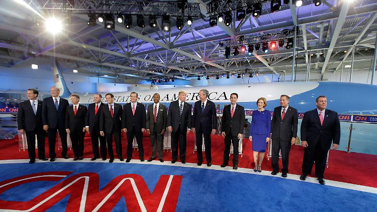 Genauso geht es den meisten Präsidentschaftsbewerbern auf der Bühne. Ihre Umfrageergebnisse heben nicht ab, sondern kleben im einstelligen Bereich – oder sind gar, wie bei Präsidentensohn und -bruder Jeb Bush, aus dem zweistelligen in den einstelligen Bereich abgestürzt.
