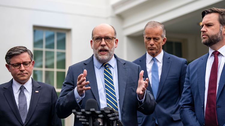 Russell Vought (2.v.l.) äußert sich vor dem Weißen Haus - eingerahmt von den beiden Mehrheitsführern im Kongress und Vizepräsident JD Vance (rechts).