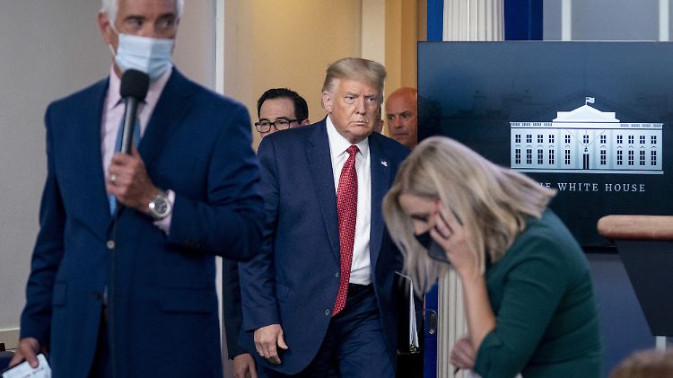Der Präsident war bei der Pressekonferenz am Montag nach nur wenigen Minuten aus dem Raum geführt worden, nachdem ein Mitarbeiter an ihn herangetreten war und Trump zufolge ins Ohr geflüstert hatte, dass er mitkommen solle. Der US-Präsident gab einen Laut der Verwunderung von sich, schaute noch einmal in den Presseraum und ging dann ruhig aus dem Zimmer.