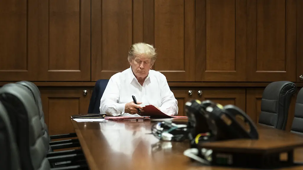 Das Weiße Haus veröffentlichte zudem zwei Fotos, die Trump bei der Arbeit zeigen. Einmal sitzt er im Anzug ohne Krawatte an einem runden Schreibtisch und schaut sich Akten an. In dem anderen Bild sitzt er ohne Sakko am Kopf eines langen Konferenztisches und blättert in Dokumenten.