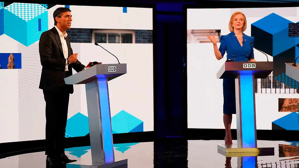 Sunaks Fokussierung auf einen ausgeglichenen Haushalt würde die Wirtschaft in eine Rezession stürzen, sagte Truss zu Sunak. "Die Wirtschaft zusammenbrechen zu lassen, um Schulden schneller zurückzuzahlen, wäre ein großer Fehler." Sie wolle sofort handeln, weil die Menschen Mühen hätten, über die Runden zu kommen. Ihr Rivale im Rennen um die Tory-Parteiführung habe als Finanzminister die Steuern auf "den höchsten Satz seit 70 Jahren" angehoben. Sunak entgegnete, dass Truss' versprochene Steuersenkung nichts anderes als ein "Zuckerrausch" für die Wirtschaft seie, auf den unweigerlich der Absturz folgen würde. Sunak will zunächst einen Rückgang der auch in Großbritannien vergleichsweise hohen Inflation abwarten.