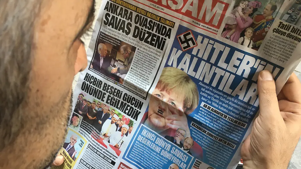 Nach der Kritik von Bundeskanzlerin Angela Merkel und ihrem SPD-Herausforderer Martin Schulz an der Türkei hat die regierungsnahe türkische Zeitung "Aksam" Nazivorwürfe gegen Deutschland erhoben. Das Blatt erschien mit Hakenkreuz auf der Titelseite und der Schlagzeile: "Hitlers Überbleibsel". Auf ein Foto Merkels war oberhalb ihrer Oberlippe in kleinen schwarzen Buchstaben ihr Name gedruckt, was den Anschein eines Hitler-Bartes erweckte. Darunter fand sich ein kleineres Bild, das Schulz und EU-Kommissionspräsident Jean-Claude Juncker zeigte.