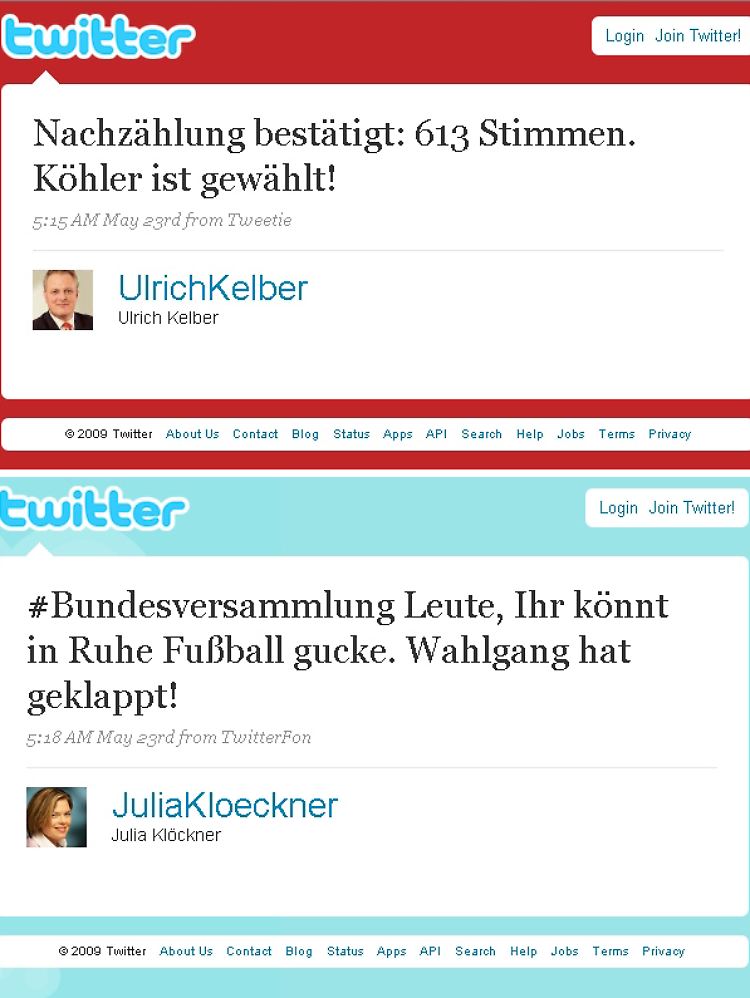 Die CDU-Abgeordnete Julia Klöckner hatte den Erfolg Köhlers am Samstag knapp 15 Minuten vor der offiziellen Verkündung verbreitet. Sie war Mitglied der Zählkommission. Am Montag hatte sie angekündigt, auf das Amt als Schriftführerin im Parlament zu verzichten. Der SPD- Fraktionsvize Ulrich Kelber, der noch früher über Twitter Köhlers Wahl mit der exakten Stimmenzahl von 613 Stimmen verkündet hatte, verteidigte dagegen seine Botschaft.
