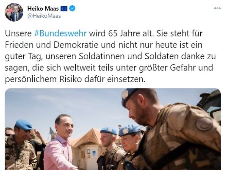 Update: Maas hat den Tweet mittlerweile gelöscht. Er schrieb dazu, ebenfalls auf Twitter: "Unsere Bundeswehr arbeitet eng mit anderen Streitkräften zusammen. Auf meinem Foto zum Bundeswehrjubiläum waren so auch belgische SoldatInnen - es entstand, als ich die Bundeswehr 2019 in Mali besuchte. Der Tweet ist gelöscht, um Missverständnisse zu vermeiden. Mein Dank bleibt."