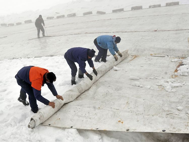 Das Eis schmilzt. Damit das auf der Zugspitze etwas länger dauert, wird der Gletscher im Sommer zugedeckt. Hier ein Bild vom 3. Juni 2009.
