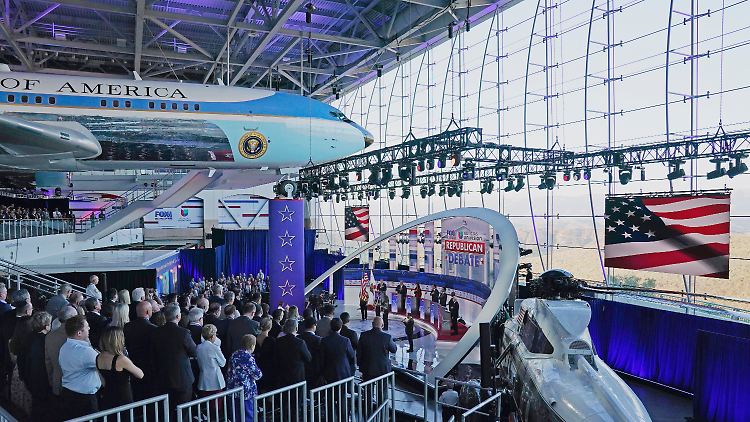 Haley und Ramaswamy führen die Umfragen unter US-Republikanern an, kurz nach Floridas Gouverneur Ron DeSantis und meilenweit, rund 40 Prozent, hinter Donald Trump. Der Ex-Präsident hielt es wie schon bei der ersten Fernsehdebatte nicht für nötig, aufzutauchen. Auch ohne ihn ist das inhaltliche Niveau der Diskussion der sieben Bewerber relativ niedrig, aber symbolträchtig: Sie stehen in der Ronald-Reagan-Bibliothek in Kalifornien, schräg unter einer Air Force One. Ab und zu werden den Fernsehzuschauern kleine Zitatschnipsel des verehrten Ex-Präsidenten eingespielt.