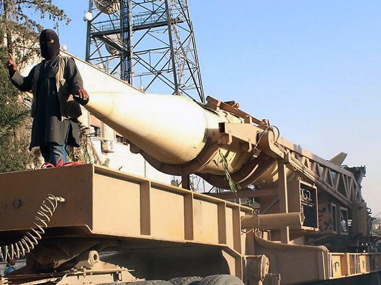 Bei ihren Eroberungszügen fallen den IS-Milizen auch schwere Waffensysteme in die Hände: Hier ein radikalislamischer Kämpfer mit einer Boden-Boden-Rakete in Ar-Rakkah am Euphrat.