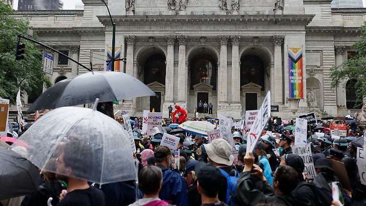 Bei den Anti-Trump-Protesten trotzten in New York Tausende Demonstranten dem Regen. Laut ersten Schätzungen der Organisatoren gingen dort 200.000 Menschen auf die Straßen. Immer wieder skandierten sie: "So sieht Demokratie aus" und forderten die Absetzung Trumps, wie ein Reporter berichtete. Auf vielen Schildern wurde die Arbeit der Einwanderungspolizei ICE kritisiert, manche trugen Aufschriften wie: "Wenn ich einen Diktator will, dann frag' ich meine Katze."