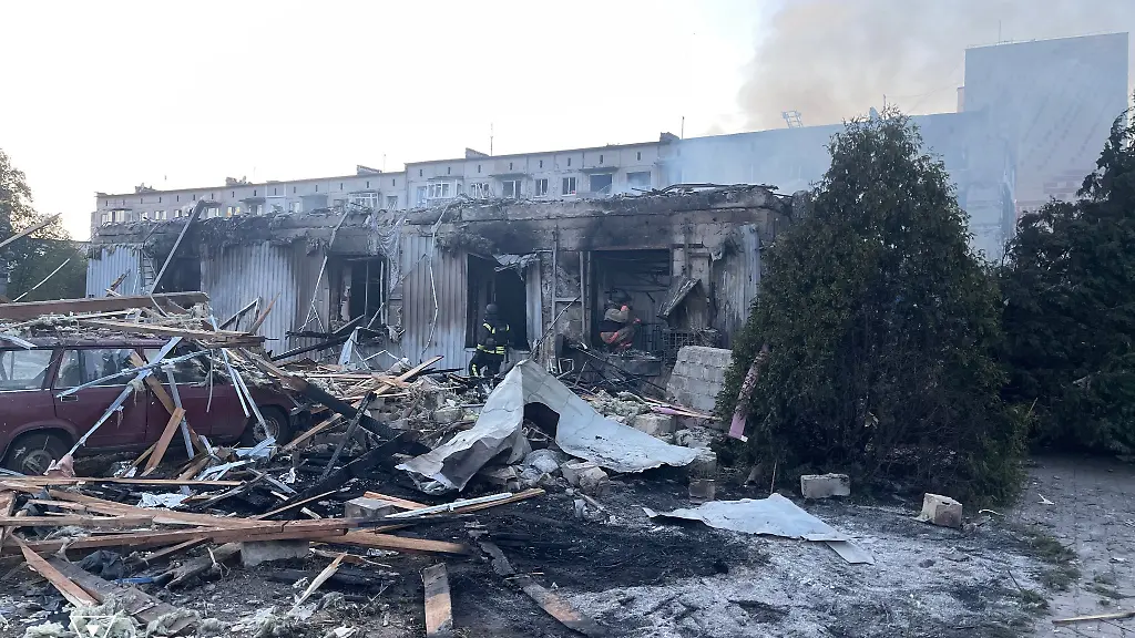 Der staatliche Notfalldienst der Ukraine berichtete zudem von 67 beschädigten Geschäften und Wohnhäusern. In einem zweistöckigen und in einem fünfstöckigen Geschäft seien Feuer ausgebrochen, hieß es. Auf Bildern aus dem Ort sind massive Zerstörungen an diversen Gebäuden zu sehen.