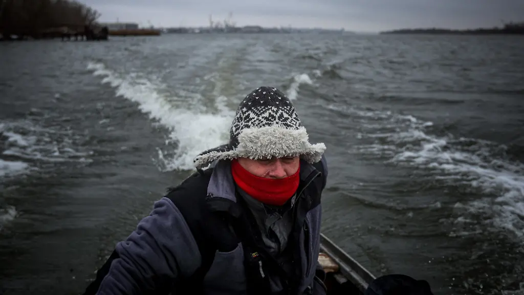 Nach 40 Minuten Fahrt durch den eiskalten Wind legt Kowbasjuk an und trifft auf den Rentner Oleksandr Sokolyk. "Oleksij, Bruder! Ich bin so froh, dich zu sehen", ruft der 64-Jährige und umarmt Kowbasjuk. "Die Lage in Cherson scheint jetzt besser zu sein. Wir hier haben seit einer Woche keinen Strom mehr", sagt Sokolyk, der ebenfalls Inselbewohner zum Festland bringt. "Und jede Nacht stehen wir unter Beschuss. Die Granaten fliegen von links nach rechts, von rechts nach links über uns hinweg."
