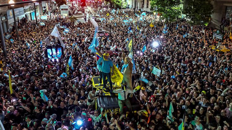 In seinen beiden kurzen Siegesreden sagte der Ökonom zunächst vor Kollegen seiner Partei "La Libertad Avanza" ("Die Freiheit schreitet voran"), und danach vor Anhängern im Zentrum der Hauptstadt Buenos Aires: "Heute beginnt der Wiederaufbau Argentiniens!" Es gebe keinen Raum für graduellen Wandel. "Die Veränderungen, die das Land braucht, sind drastisch." Er zog Vergleiche mit dem Argentinien des 19. Jahrhunderts: "Wir werden wieder eine Weltmacht", kündigte er an. Dies werde 35 Jahre dauern. Noch nie in der argentinischen Geschichte blieb eine politische Strömung auch nur annähernd so lange an der Macht.
