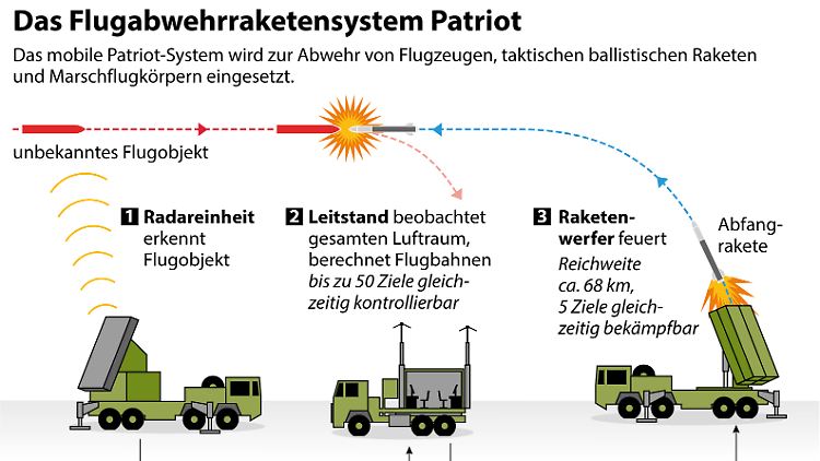 Das Radar hat eine Reichweite von etwa 150 Kilometern, die in Kombination mit anderen Radarsystemen sogar noch gesteigert werden könne, so Reisner. Auf der Website der Bundeswehr heißt es zu dem Patriot-System: "Schneller als der Schall". Das Abwehrsystem erkennt feindliche Raketen also bereits aus weiter Ferne und ist in Lage, schnell auf Angriffe zu reagieren.