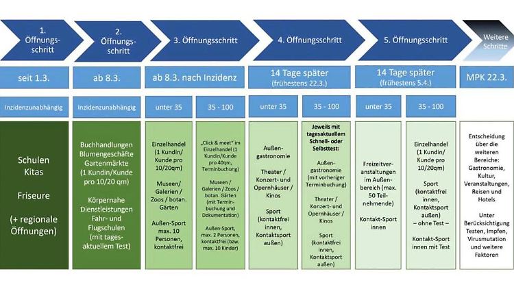 Mit fünf Öffnungsschritten soll es vorsichtig zurück in die Normalität gehen - wenn die Entwicklung der Inzidenzen mitspielt. Eine Übersicht über den Stand der Beratungen.