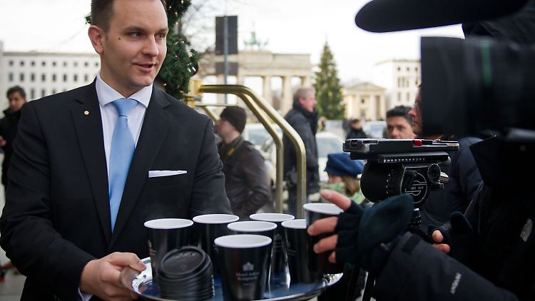 Das "Adlon" lässt sich nicht lumpen und spendiert heiße Getränke für die wartenden Journalisten.