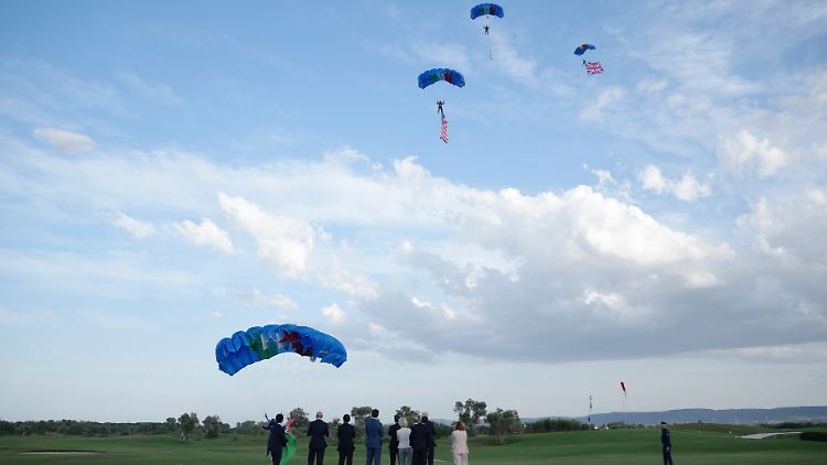 Auf einem Video ist zu sehen, wie die versammelten Staats- und Regierungschefs auf einem Golfplatz im süditalienischen Apulien gemeinsam mehrere Fallschirmspringer beobachten. Die Soldaten des italienischen Heeres landen rund um die Gruppe.