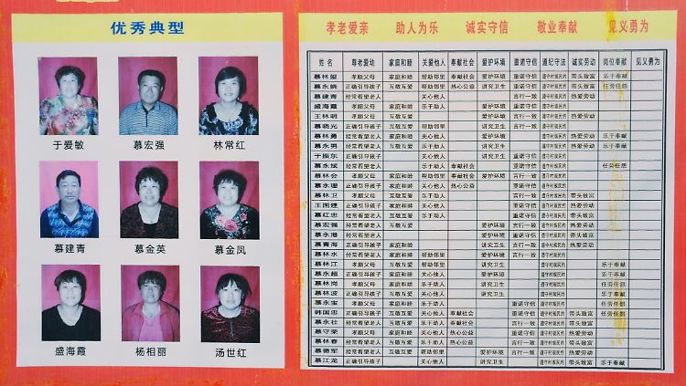 In der Stadt Rongcheng, wo das Sozialkreditsystem getestet wird, werden besonders vorbildliche Bürger auf einer Tafel abgebildet (Bild von 2018).