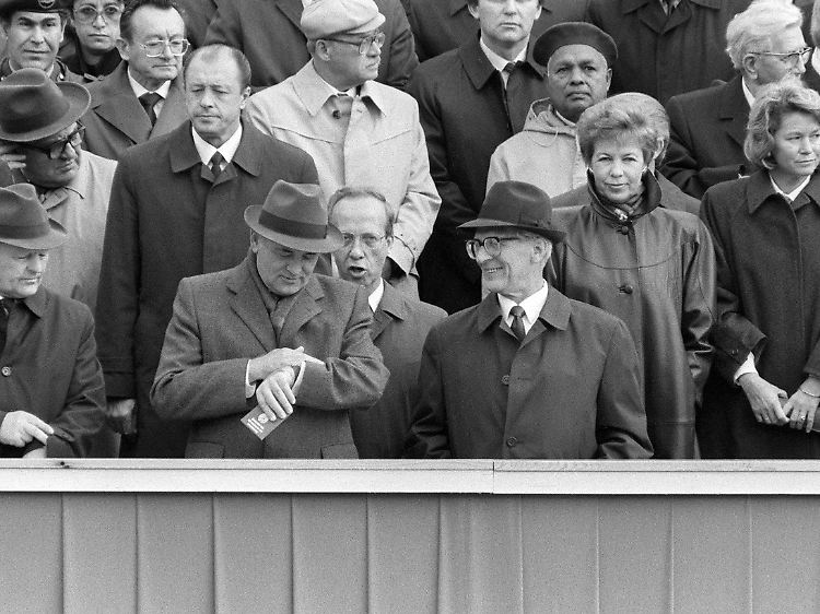 Ein Bild mit Symbolik: Honeckers Zeit als SED-Generalsekretär ist abgelaufen. Er verdrängt zum 40. DDR-Geburtstag (hier mit Michail Gorbatschow bei der Militärparade am 7. Oktober) die Realität.