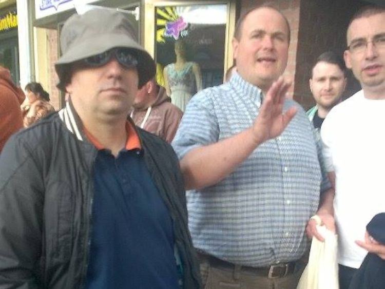 AfD-Kandidat Schneider (l.) mit Anglerhut und Sonnenbrille am 8. Juni 2015 bei einer Demo in Grevesmühlen mit Torgai Klingebiel (Mitte), Mitarbeiter von NPD-Landeschef Köster.