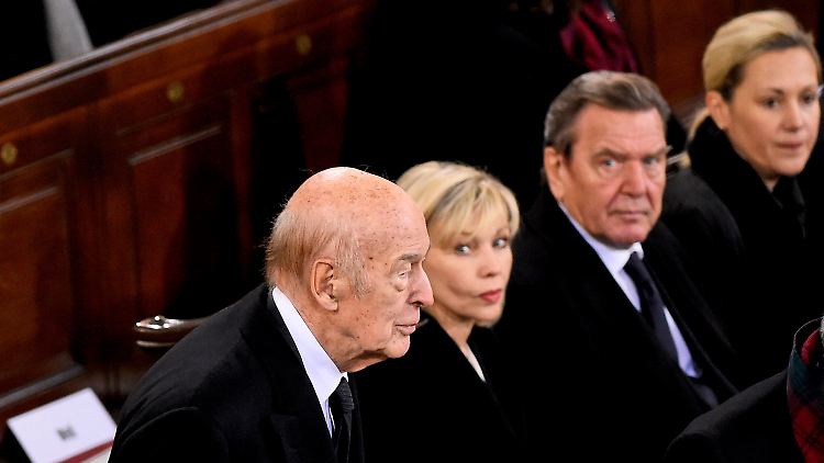 Valéry Giscard d'Estaing, Doris Schröder-Köpf, Gerhard Schröder und Bettina Wulff (v.l.n.r.) im Hamburger Michel. Wulff begleitete ihren Mann, Altbundespräsident Christian Wulff (nicht im Bild).