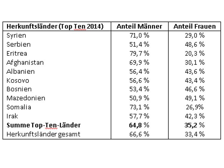 Interessant ist aber ein Blick auf die Unterschiede je nach Herkunftsland. Auffallend ist, dass vor allem aus den Bürgerkriegsländern mehr Männer als Frauen kommen. Von den syrischen Asylanträgen wurden im vergangenen Jahr 71 Prozent von Männern eingereicht – bei den Serben waren es dagegen nur 51,4 Prozent Männer. Die Anträge von Personen aus Eritrea kamen sogar zu fast 80 Prozent von Männern. Damit ist klar: Je weiter und damit gefährlicher die Reise nach Deutschland, umso geringer ist der Anteil von Frauen.