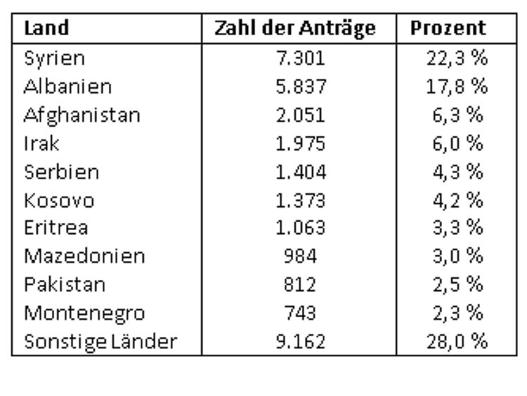 Das stimmt nicht. Im aktuellen Ranking der Herkunftsländer steht Syrien an erster Stelle, gefolgt von Albanien, Afghanistan, dem Irak, Serbien, dem Kosovo, Eritrea, Mazedonien, Pakistan und Montenegro.