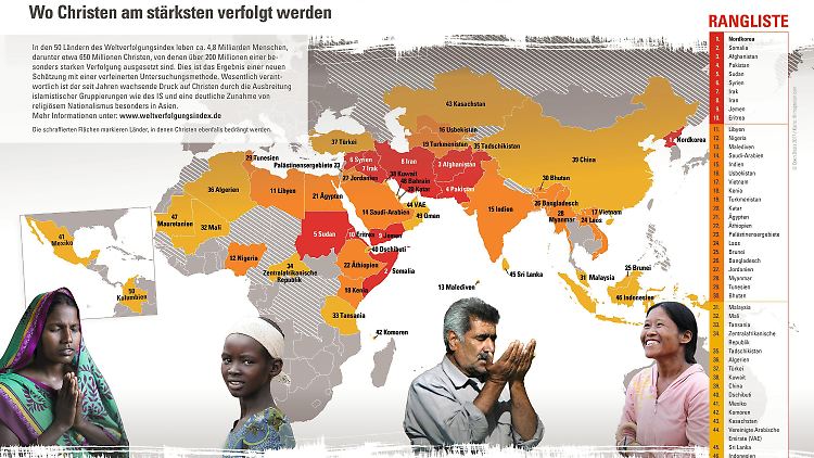 Nach Erhebungen des christlichen Hilfswerks Open Doors hat sich die Zahl der verfolgten Christen in den vergangenen Jahren verdoppelt. Weltweit würden derzeit mehr als 200 Millionen Christen wegen ihres Glaubens Schikanen, Gewalt und Verfolgung ausgesetzt, heißt es im Weltverfolgungsindex 2017 der Organisation. Die Christenverfolgung weltweit habe an Dynamik gewonnen. Ausmaß und Intensität hätten zugenommen.