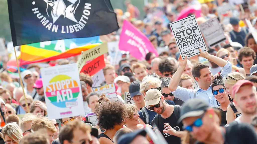 Eine Woche vor den Landtagswahlen in Sachsen und Brandenburg "sagen Menschen aus dem ganzen Land Nein zu jeder Art von völkischem Gedankengut und unsolidarischer Politik", erklärten die Veranstalter vom Bündnis Unteilbar. Die Botschaft von Dresden sei: "Wir lassen nicht zu, dass Sozialstaat, Flucht und Migration gegeneinander ausgespielt werden." In Sachsen und Brandenburg wird am 1. September der Landtag neu gewählt, in Thüringen am 27. Oktober. Umfragen sagen starke Zuwächse für die rechtspopulistische AfD voraus, in Brandenburg liegt sie etwa gleichauf mit der SPD.