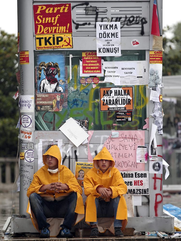 Im Protestlager der Demonstranten im Gezi-Park hielten am Morgen mehrere hundert Menschen nach Angriffen der Polizei die Stellung. Mit dünnen Regenmänteln bekleidet schoben sie Müll zusammen. Was die Polizei in der Nacht nicht zerstört hatte, wurde von einem Regen dahingerafft.