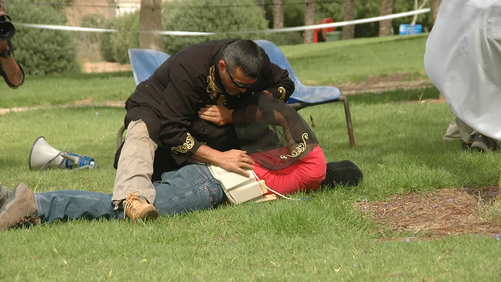 Julian D. ist gebürtiger Christ aus dem Libanon. Im Gelände eines Schießstandes nahe Sderot in Israel hat er sich gerade des ausladenden Gewandes eines arabischen Scheichs entledigt. Über sein rotes T-Shirt mit der Aufschrift "Hilfiger Denim" schnallt er sich nun einen Stoffgürtel um. Aus Fächern des Gürtels schauen Drähte hervor. Der schlecht getarnte Selbstmordattentäter zieht sich eine schwarze Maske über. Julian rennt auf Tische zu, wo Ärzte in weißen Kitteln unter riesigen UNO-Flaggen Patienten in arabischer Tracht befragen. "Terrorist, Terrorist" ruft da einer. Einige der "Patienten" tragen unter ihren Mänteln Uzi-Schnellfeuerpistolen. Einer springt auf und wirft sich auf Julian. Im hohen Bogen stürzt der auf den Rasen. Ein paar Schläge auf den Hinterkopf und schon ist der Gürtel des Selbstmordattentäters entschärft. Nach einer wilden Schießerei liegt Schwefelgeruch in der Luft. Eine Rauchbombe versperrt die Sicht. Neben Julian liegen noch drei weitere überwältigte Terroristen am Boden.