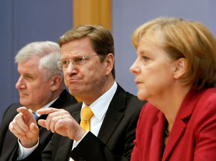 Zunächst aber stand am Samstagmittag die Freude im Vordergrund. Westerwelle schlug seinem neuen Duzfreund Horst Seehofer (CSU) lächelnd auf die Schulter, Merkel sprach von "Mut und Lust" auf die Arbeit der neuen Regierung. Und auch, dass nach den fast zwölfstündigen Schlussverhandlungen in der Nacht zuvor noch das ein oder andere Bier zusammen im Keller der nordrhein-westfälischen Landesvertretung getrunken worden sei, wurde berichtet.