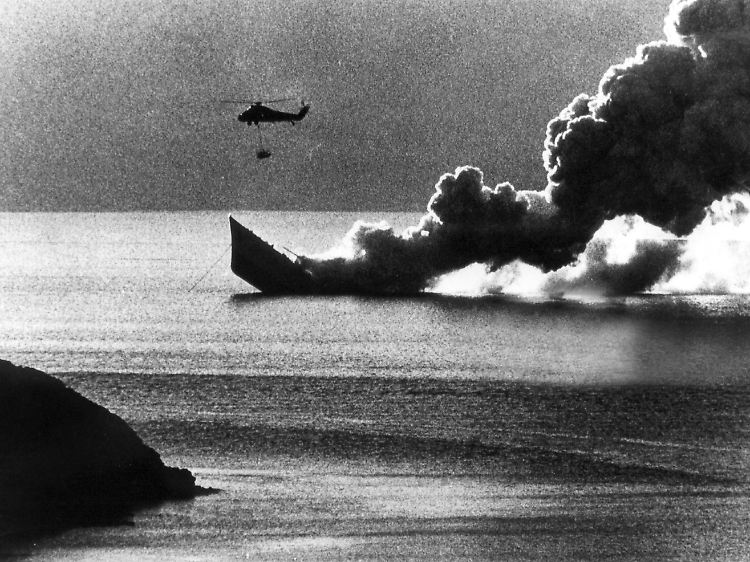 Das bei einem argentinischen Luftangriff getroffene britische Kriegsschiff HMS Antelope versinkt in der Ajax Bucht vor den Falkland-Inseln (Archivfoto von 1982).