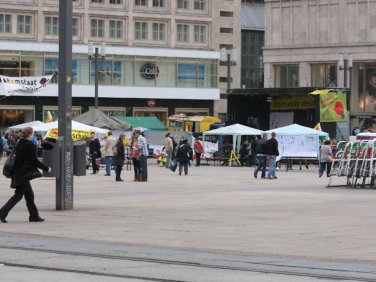 Die "Vollversammlung gegen Atomanlagen", ein Bündnis organisierter Atomkraftgegner, hat für die Dauer des Atomforums zu einem Camp gegen die Atomkraft auf den Berliner Alexanderplatz eingeladen. Ihre Vorstellungen gingen dabei wohl eher in Richtung wendländischer Lagerfeuerromantik. Doch auf dem Alex gibt nun mal keine Bauern, die Strohballen und Brennholz spendieren, niemand seilt sich von Brücken ab, auch gibt es nichts zu schottern. Aus dem Beton des Alex kann man auch keine Pflastersteine puhlen. Ordnungsamt und Polizei untersagten das klassische Camp, genehmigten aber Bühne, Showprogramm, Infostände, Clownerie und eine allabendliche Silent-Disco. Unter Funkkopfhörern rocken hunderte Besucher nach von außen her nicht wahrnehmbaren Rhythmen. Gespenstisch. Hauptstadt eben.