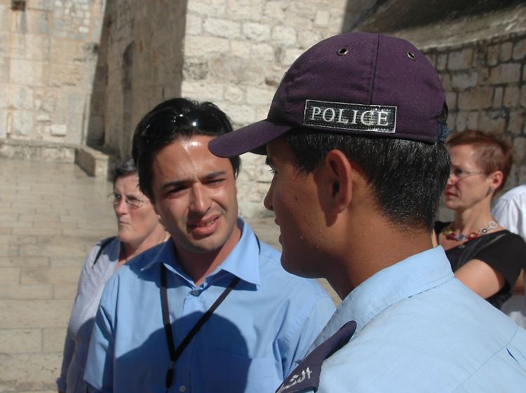 Der erste israelische Tourguide in Bethlehem im Gespräch mit einem palästinensischen Polizisten.