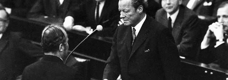 27. April 1972: Rainer Barzel gratuliert Willy Brandt, nachdem das von der Opposition angestrengte Misstrauensvotum gegen Brandt gescheitert ist.