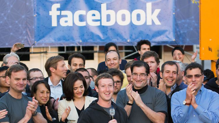 Mark Zuckerberg inmitten seiner Mitarbeiter bei der Öffnung des Nasdaq am Tag des Börsenganges.