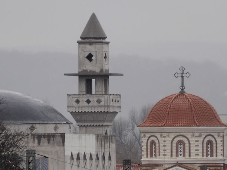 Das Minarett der im Bau befindlichen Esslinger Moschee vor der Kuppel der griechisch-orthodoxen Kirche "Mariä Verkündigung".