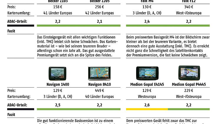 Insgesamt vergaben die Tester fünfmal die Note "gut" an Premiumgeräte. Die Modelle von Becker, Falk, Navigon, Medion und Garmin erfüllten damit die Erwartung in ihren höheren Preis. Eine Sonderstellung nahm das Navigon 8410 ein: Mit einem Preis von rund 450 Euro war es zwar das teuerste im Test, setzte aber auch Maßstäbe durch seine exzellente Sprachausgabe und seine Darstellungsqualität der Route.