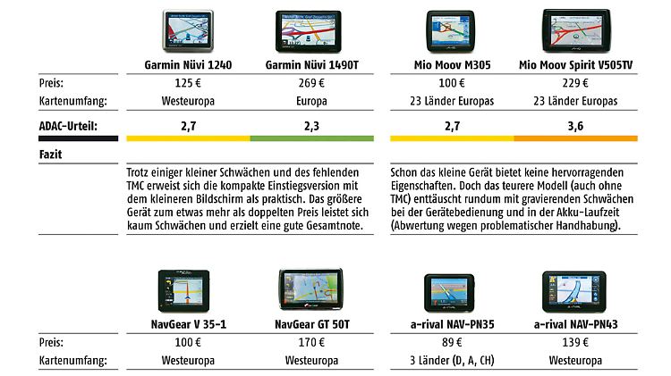 Die meisten Basisversionen zeigten gute oder befriedigende Leistungen. Zwar sind sie meist einfacher ausgestattet, in der wichtigsten Grundfunktion, der Navigation, versagte aber keines. Bei einigen Modellen vermissten die Tester den Traffic Message Channel (TMC) zur Stauumfahrung. Zum besten Einsteigergerät kürten die Tester mit der Note 2,2 das Becker Z103. Gerade noch befriedigend schnitt das das a-rival NAV-PN35 mit 3,4 ab. Gravierende Schwächen, die zur Abwertung geführt hätten, fand der ADAC bei keinem der Einsteiger-Navis.
