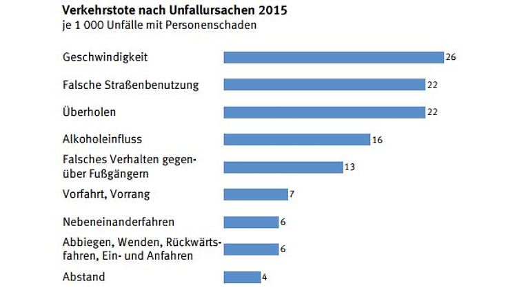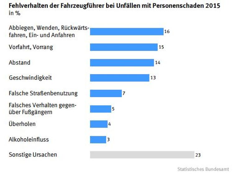 Am häufigsten krachte es 2015 allerdings beim Abbiegen, beim Wenden und beim Rückwärtsfahren. Auch Unachtsamkeiten beim Ein- und Anfahren enden oft im Krankenhaus. 16 Prozent der Unfälle mit Personenschaden wurden auf diese Weise verursacht. Tödlich verlaufen solche Fehler aber eher selten. Das Gleiche gilt für missachtete Vorfahrt und zu geringen Abstand: Diese Arten von Fehlverhalten führen zwar oft zu Unfällen, aber selten zu so schweren, dass jemand dabei stirbt.
