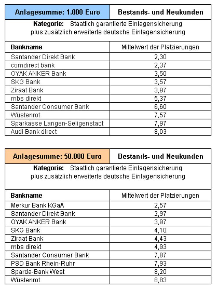 Wer kein Risiko eingehen möchte, der sollte eine Bank wählen, die sowohl über eine staatlich garantierte als auch deutsche Einlagensicherung verfügt. So gehören fast alle deutschen Banken freiwillig dem Einlagensicherungsfonds an. Je nach Bankinstitut sind die Ersparnisse dann in Milliardenhöhe gesichert. Kleinanleger finden in dieser Kategorie bei der Santander Direkt Bank das beste Angebot. Für Sparer, die mehr als 50.000 Euro als Tagesgeld parken wollen, bietet die private Merkur Bank sehr gute Konditionen.
