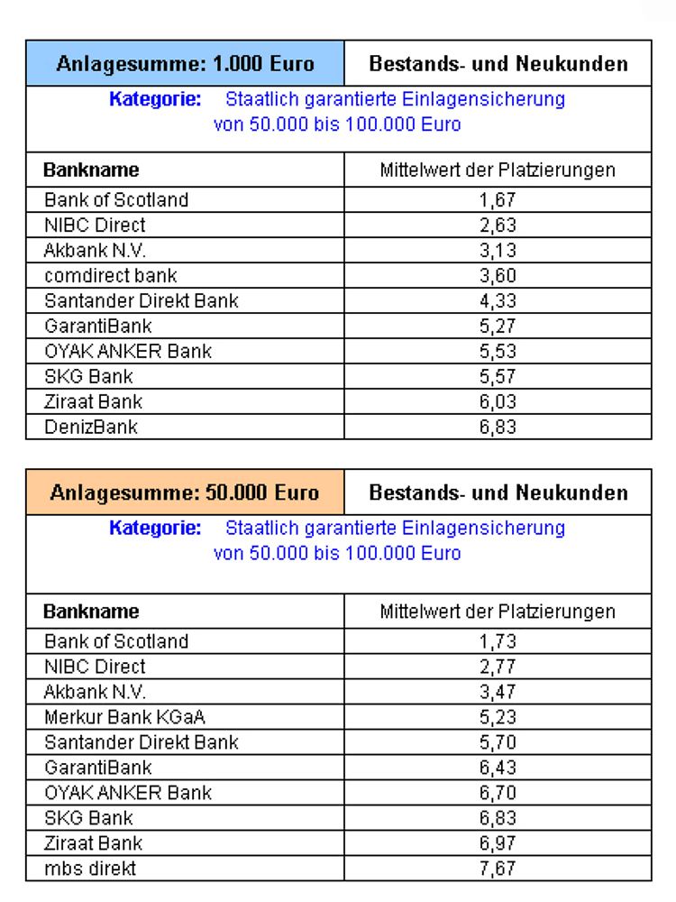 Wem eine rein staatlich garantierte Einlagensicherung von 50.000 bis 100.000 Euro genügt, der findet bei der Bank of Scotland sowie den niederländischen Banken NIBCdirect und Akbank NV die besten Tagesgeldangebote. Dass ab 2011 die Einlagensicherung europaweit vereinheitlicht wird, begrüßt auch der Deutschlandchef der Bank of Sotland, Bertiel Bos: "Jetzt kann ich den Wettbewerb unter den Banken vergleichen. Wo finde ich die höchsten Zinsen, wo den besten Service, usw. Das ist für uns, für alle Banken und für die Kunden gut."