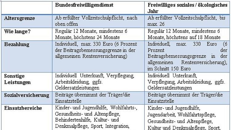 Der Bundesfreiwilligendienst eignet sich für Schul- und Uniabgänger in der Orientierungsphase ebenso wie für Hausfrauen, die ins Berufsleben zurückkehren wollen oder für Rentner, die nach einer zusätzlichen Aufgabe suchen. Anders als das freiwillige soziale oder ökologische Jahr (FsJ / FöJ), das sich ausschließlich an Menschen bis 27 Jahre richtet, gibt es für das BFD keine Altersbegrenzung nach oben oder unten. Einzige Bedingung: Die Vollzeitschulpflicht muss abgeschlossen sein. Auch die Arbeitszeit lässt sich flexiber gestalten als beim FSJ. Freiwillige über 27 Jahre können auch Teilzeit arbeiten – mindestens aber 20 Stunden die Woche, weitere Nebentätigkeiten sind genehmigungspflichtig.