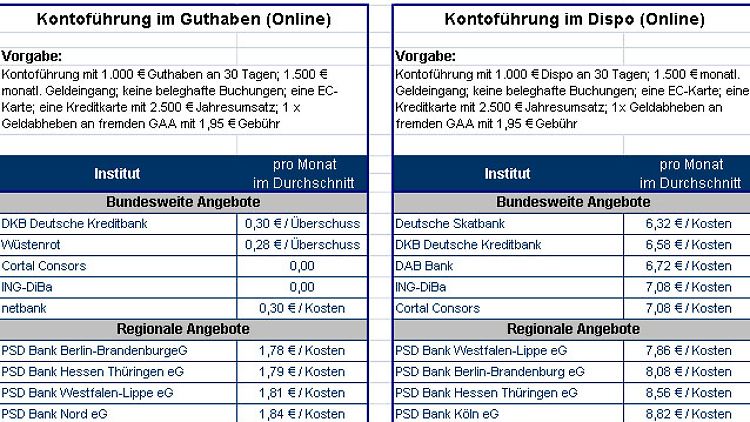 Wer sein Konto online führen will, aber regelmäßig in den Dispo rutscht, für den hat die Deutsche Skatbank das beste Angebot. Die Direktbank aus dem Altenburger Land bietet seit Jahren den mit Abstand günstigsten Dispozins – aktuell liegt er bei 5,25 Prozent. Auf dem zweiten Platz folgt wiederum die DKB, deren Dispozins mit derzeit 7,9 Prozent ebenfalls im grünen Bereich liegt. "Das zeigt, dass es Banken gibt, die kundenfreundliche, niedrige Dispozinsen anbieten und auch ohne Kontoführungsentgelten auskommen", so das Fazit von FMH-Chef Max Herbst. Im Schnitt kassieren Banken und Sparkassen laut Stiftung Warentest derzeit rund elf Prozent Dispozinsen.