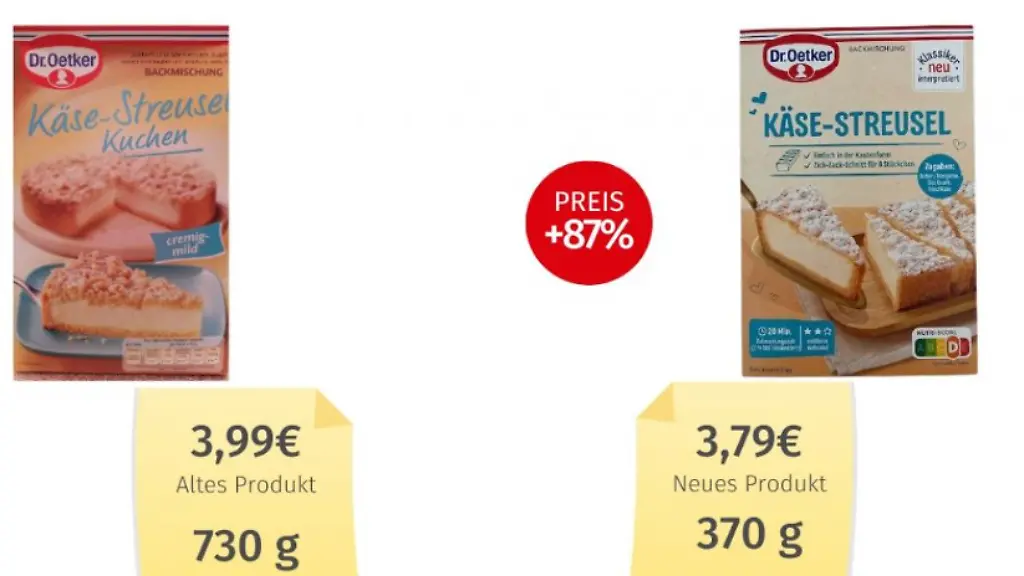 Das Produkt enthält nur noch 370 Gramm. Zuvor waren es 730 Gramm Backmischung für den Käse-Streusel Kuchen pro Packung. Der Preis sank teilweise im Handel minimal - von 3,99 auf 3,79 Euro. Bei meist leicht reduziertem Preis bedeutet das eine versteckte Preiserhöhung von knapp 90 Prozent. Unterm Strich zahlen Verbraucher also fast das Doppelte pro Kilo Backmischung.