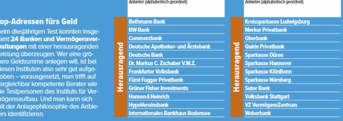 Wo werden vermögende Kunden in Deutschland bei der Geldanlage am besten beraten? Das zeigt der große Test von ntv und Focus-Money. In diesem Jahr konnten insgesamt 24 Vermögensverwalter und Banken mit einer herausragenden Leistung überzeugen.