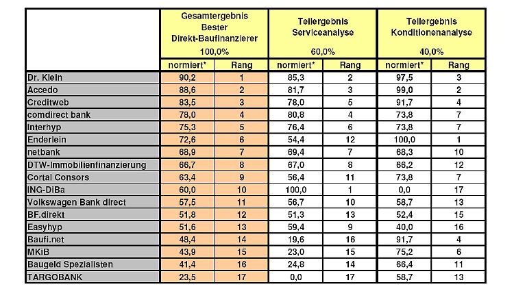 Zum Gesamtsieger der Studie wurde der Lübecker Finanzierungsspezialist Dr. Klein gekürt, auf den weiteren Plätzen folgten Accedo und Creditweb, alles reine Vermittler. Comdirect bot die beste durch Banken vermittelte Direkt-Baufinanzierung an. Die besten Konditionen hatte Enderlein, der beste Service war wie auch schon in den beiden Vorjahren bei ING-DiBa zu finden.