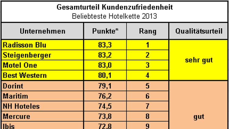 Das beste Gesamtergebnis erreichte Radisson Blu und ging damit als "Beliebteste Hotelkette 2013" aus der Befragung hervor. Das Unternehmen punktete bei seinen Gästen mit dem sehr guten Service und top Zimmern. Ein kundenfreundlicher Buchungsprozess und sehr hohe Zufriedenheitswerte mit dem gastronomischen Angebot rundeten das Ergebnis ab. Auf dem zweiten Rang platzierte sich Steigenberger. Die Hotelkette überzeugte vor allem mit dem besten Hotelpersonal. Die Befragungsteilnehmer zeigten dafür die höchste Weiterempfehlungsbereitschaft von allen Hotelketten. Motel One belegte den dritten Rang. Die Gäste zeigten sich hier besonders zufrieden mit dem Preis-Leistungs-Verhältnis. Auch mit der Qualität der Zimmer konnte das Unternehmen überzeugen.